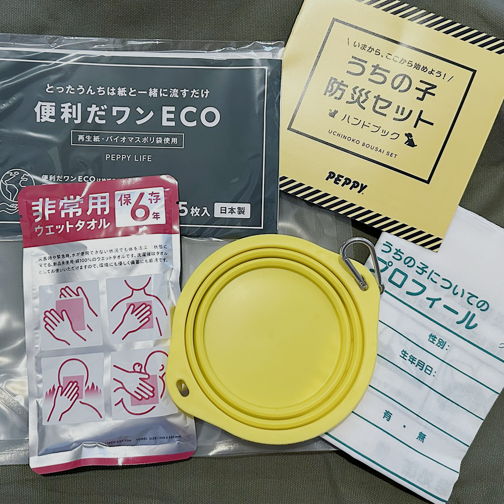 便利だワンECO(うんち用)・フードボール・ウェットタオル・防災手ぬぐいと、外の袋がウォーターバッグになり、防災についてのハンドブックがついています。