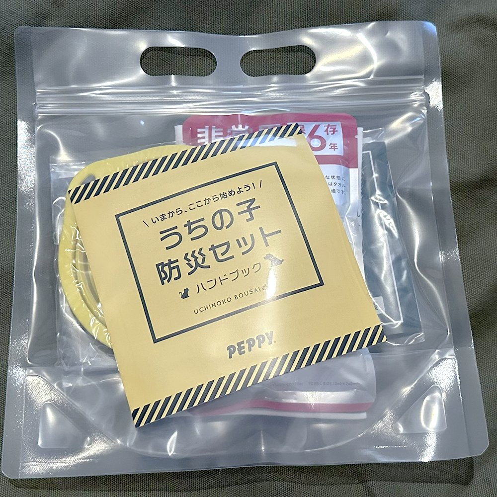 最近発売された「うちの子防災セット」には備えておきたい最も基本のものがそろっています。私もまりさん用に購入しました。